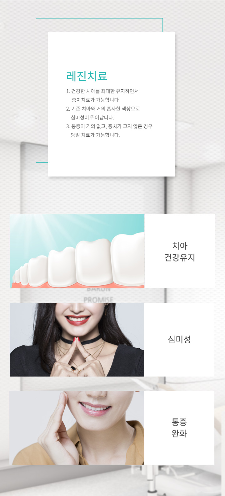 충치 제거 이후 치아색과 비슷한 색상의 레진을 이용하여 치아를 메우는 방법으로 치아와 구분이 어려울 정도로